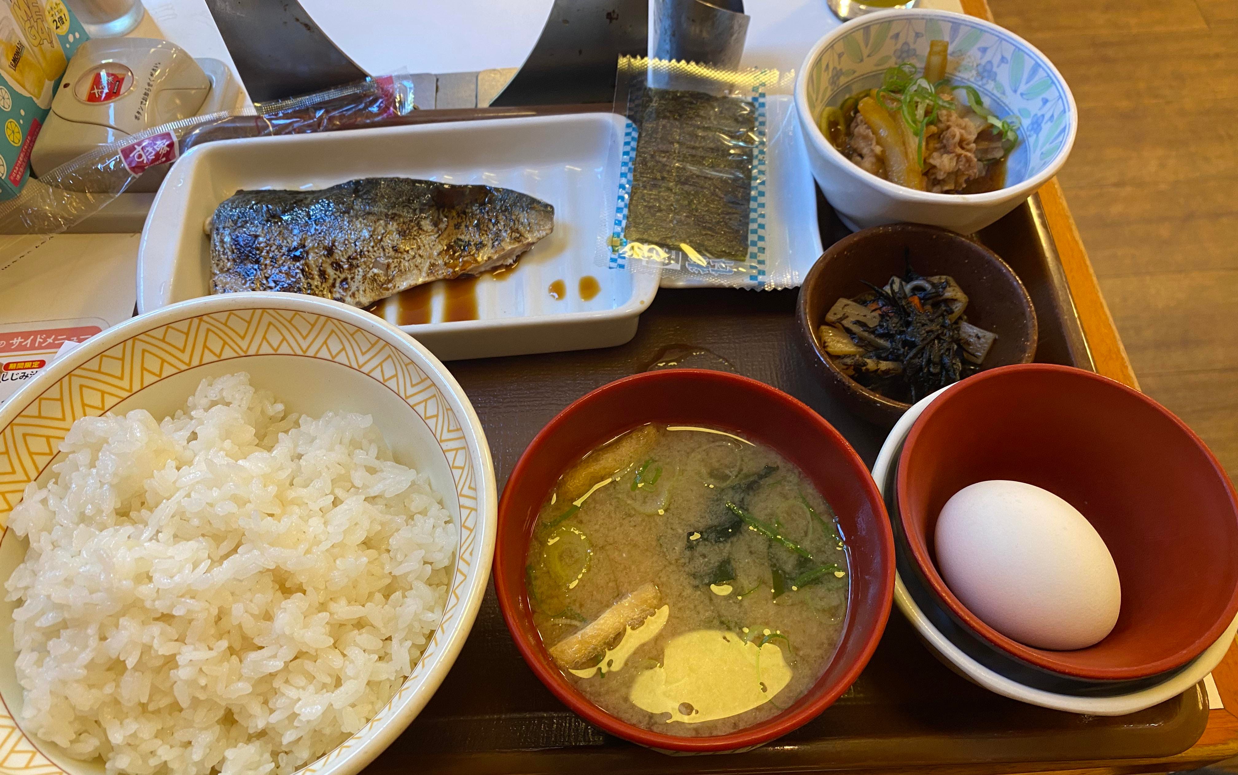 The server is back in five minutes, setting down a shocking number of bowls on a plastic tray. The unhappy sliver of fish, along with miso soup, various mystery pickles, an individually wrapped square of seaweed, chewy but flavorful roast beef, a styrofoam casket of fermented beans, and a single egg still in its shell.