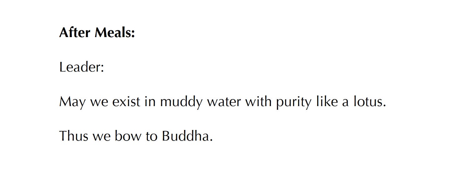 With everyone’s bowls and utensils arranged, the servers come out with the food. Isabel was expecting rice porridge, though it smells more like some vegetable. The servers kneel before the hungry monks, filling bowls according to hand gestures. A rising upturned palm means stop. A pinching thumb and forefinger means just a little, please.